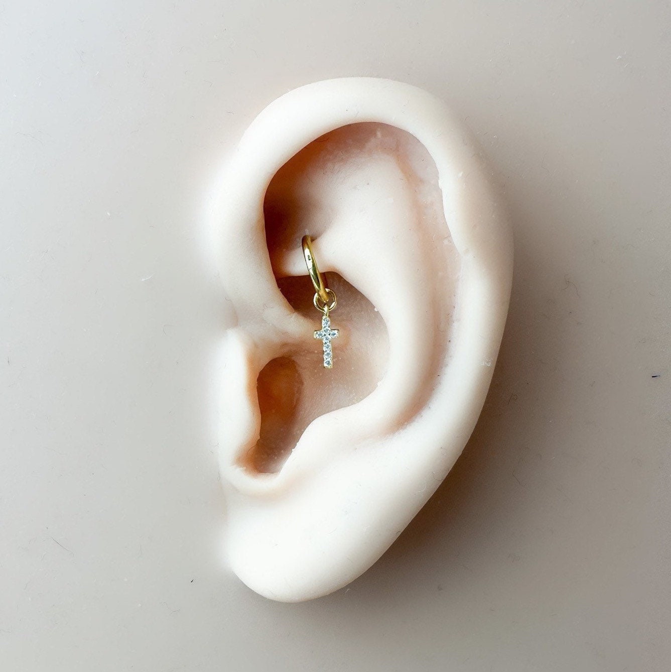 16g 18g 6mm Paved Cross Dangle Hoop Charm, sterling silver, 18k gold plated rook hoop, hoop huggies, cartilage piercing, helix hoop charm